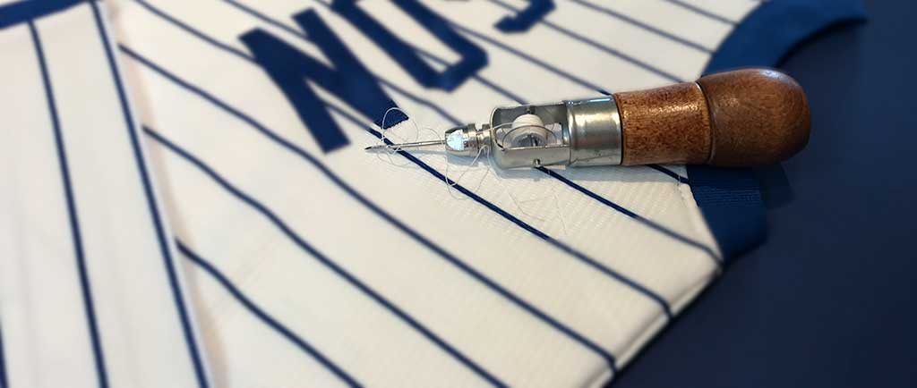 After designing and cutting the mats we move on to mounting the jersey onto the backing, which is typically the step that takes the most time because it has to be done manually, which is something we do, using our trusty sewing awl. It’s important to note that in order to avoid damaging the jersey in any way, we never use any glues of any kind and all of our materials are acid-free.